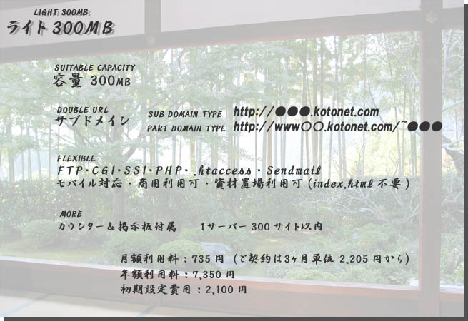 | 「お手頃 300MB」・「サブドメイン」・「豊富な機能」であなたのニーズにお応えします |